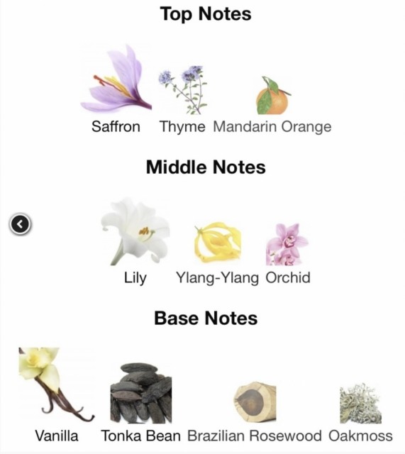Det er en dyp, sensuell og elegant parfyme som holder hele dagen. Lette og eksotiske dufter fra orkideer, safran og liljer blir overført til forførende ylang-ylang og myk sødme fra vanilje, Tonkabønner og brasiliansk rosentre.